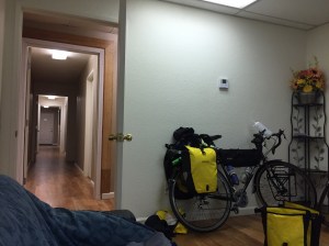 Here are the fragments of thought that pass though my mind when I am suffering up hill. “Chairs are nice. Your legs don’t move when you sit in one. Hot tubs are warm. You can rest your legs in them. How many miles is it back to San Francisco? It is mostly downhill and flat that way. That pickup truck has room for bikes. So does that one. Ooh! A van–our stuff and us can fit in there and there probably is air conditoning. That’s a nice house. If I just stopped here and never moved again, could I live there? How could I make a living? Grow olives? Run a coffeeshop? Tend to dying cyclists?” But then the ground levels out or better yet, drops, and the monologue changes. “One gear higher? Yeah I think so–good burn in the legs. Push harder–not maximizing hip swing enough. Zoom. Into the drops–get more aero, butt higher, try to rest your chin on the stem–that’s good, 40 mph is good. Jeepers the gears make a terrible noise when I drop them. It’s hot. Am I going that slow that the flies can actually keep up? That pickup truck has room for bikes.” See what happened at the end there? Every decline ends and the staircase is again before me. A sport designed for Sisyphus.