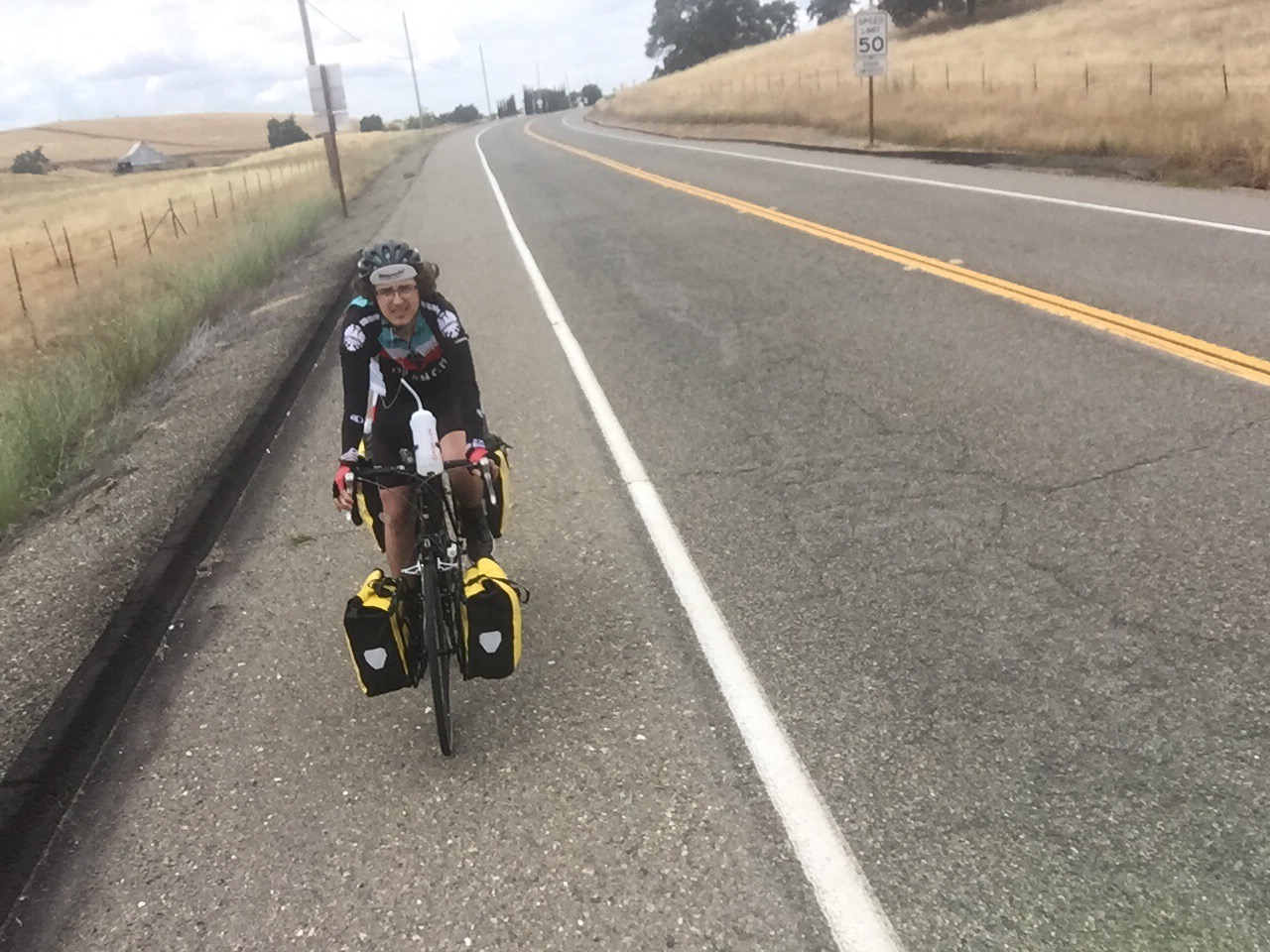 The weather was dreadful too–just too cold or too hot–impossible to get right. Arm tubes on, arm tubes off, sweat dripping down face, face cold from wind. The good news of course was that this part of California is beautiful. We were crawling out of the golden hills and heading into piney mountains and it is great. But climbing. Maybe I am not eating right? Maybe the can ditch things on the bike? Maybe it is altitude? Who knows, it is just so damned hard.
