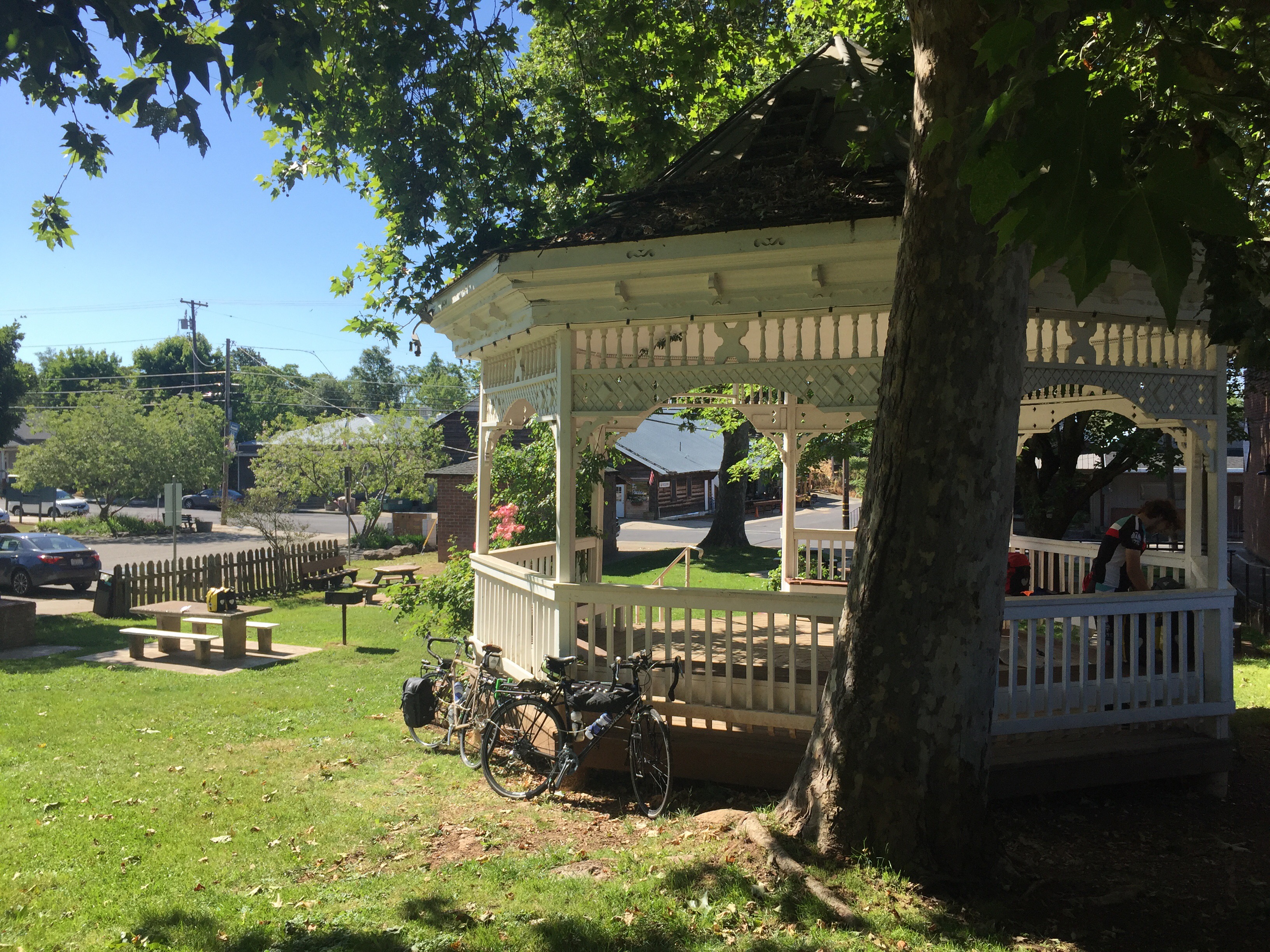 Having passed the night peacefully in Plymouth, I can now disclose the undisclosed location. It was the big lovely gazebo right in town. It became clear that cyclists stopped there often enough that it was no big deal, and so we joined their ranks.