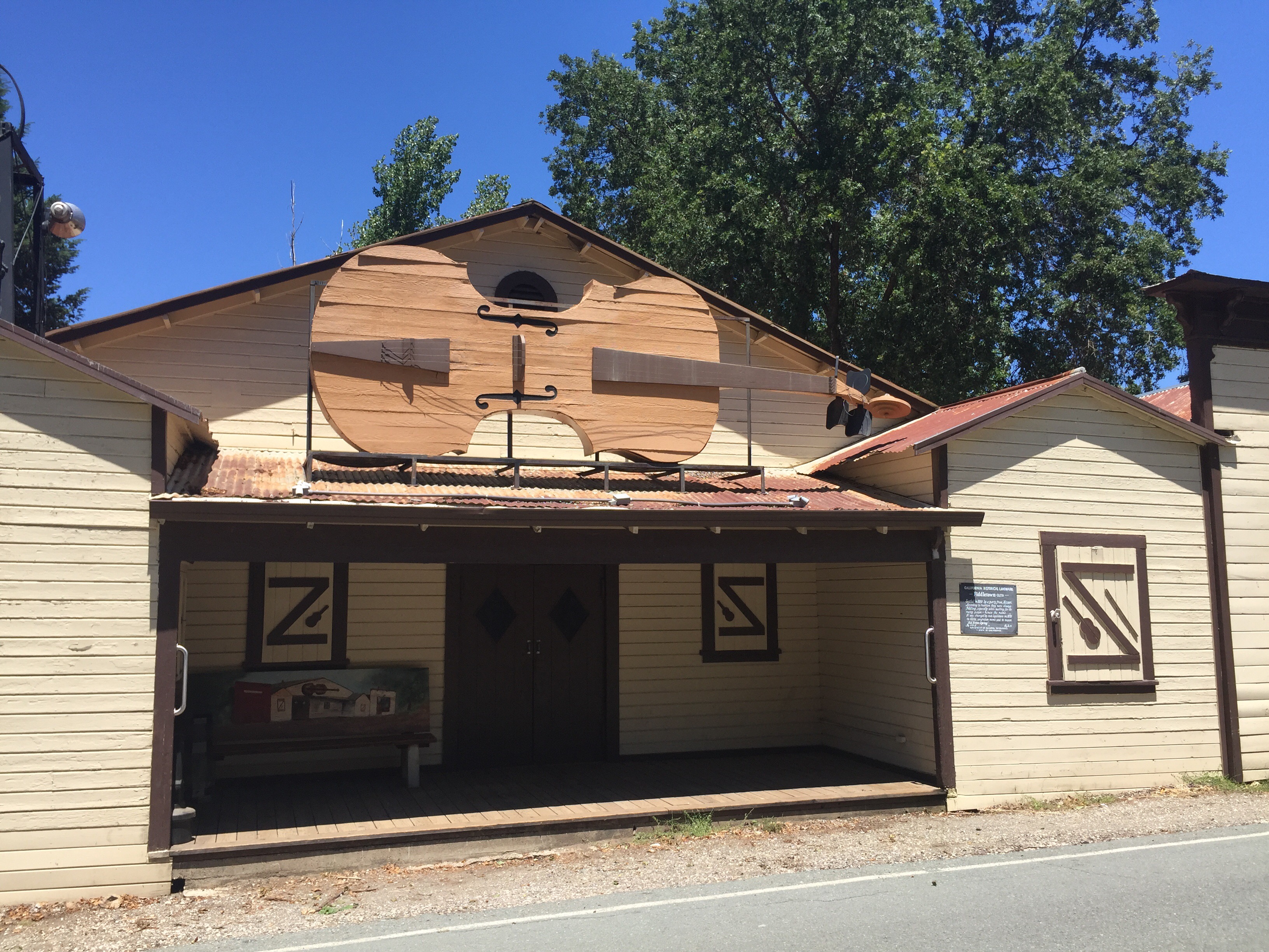 We sat for a little while in Fiddletown early on and felt like maybe we were not confronting hell. I am not sure we were all that convincing though. Even the giant fiddle on the curious town building could only raise a small smile.