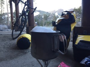 When the day was over, we were at Carson’s Pass setting up camp on the porch of the visitor station there. More angels appeared–this time in the form of a family taking in the views, fishing, and scoping out a future ride. They provided us with some water–I was melting snow to cook the pasta we bought at the store–and even gave us some ichthyic delights. A great end to an odd day that went from wanting to kill us to suddenly jumping us 20 miles ahead of our plan.