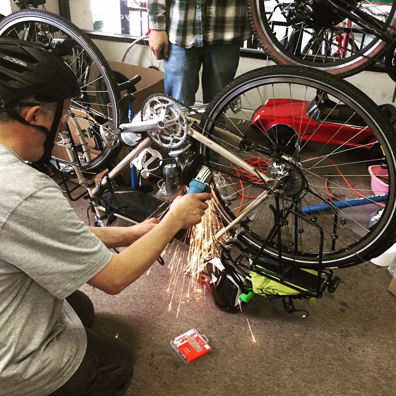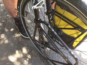 The countryside was beautiful–especially the area between Winters and Davis. The roads were dreamy and the final miles into Davis were on a great path. We crossed a great bridge over the Putah Creek. It was high and covered in great graffiti. Right around there, amidst the sun and lovely riding, the bolt holding Rami’s right pannier rack onto the fork broke gave up the ghost no doubt overcome with emotion and landscape enthusiasm. Whatever its motivation, we were suddenly roadside with a dropped pannier. The modern miracle that is the Zip Tie allowed a creative rerigging and off we went again.