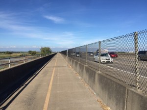 Lovely as was the ride into Davis, the ride into Sacramento was a grim contrast. There are good wide bike lanes but they are a bit, shall we say, road-sidey. We paralleled rail tracks though and that made it fun. We got to see commuter trains fly back and forth and some huge Union Pacific engines too. We also rode on the Yolo Causeway which is essentially the shoulder of west bound Rt 80 with a waist-high concrete wall and about five feet of chain link keeping us from the on coming traffic.